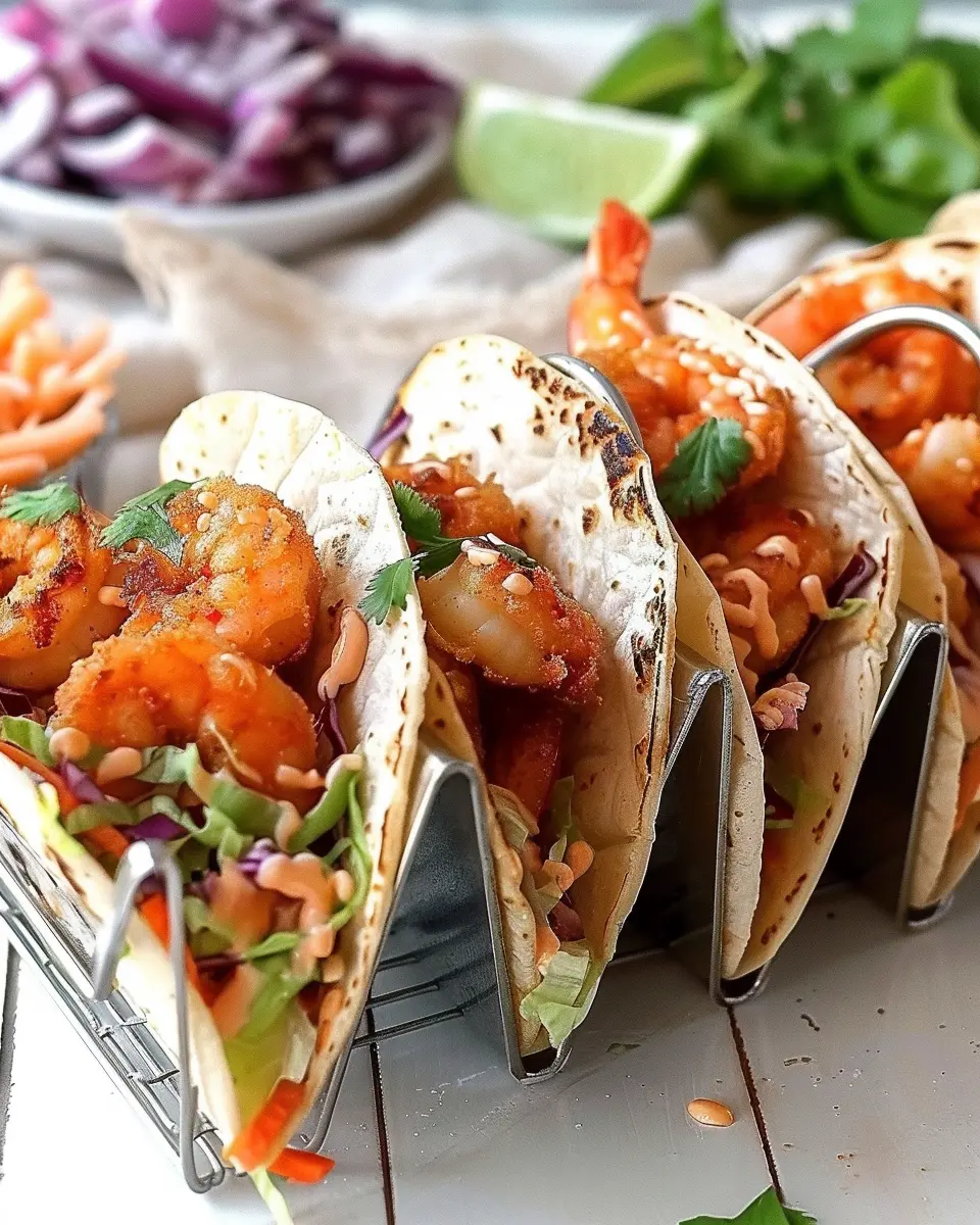 Enjoy a quick and easy recipe for Air Fryer Bang Bang Shrimp Tacos, perfect for any night of the week.