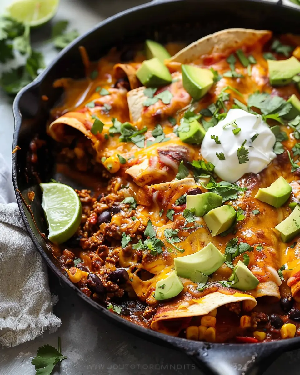 If you’re looking to boost your veggie intake while still relishing the flavors of beef skillet enchiladas, this variation is perfect. Mix in sautéed bell peppers, onions, and even zucchini or spinach into the beef mixture. Not only does this add nutrition, but it also brings color and texture to your dish. Don’t forget to top these enchiladas with a generous serving of fresh cilantro and diced tomatoes.