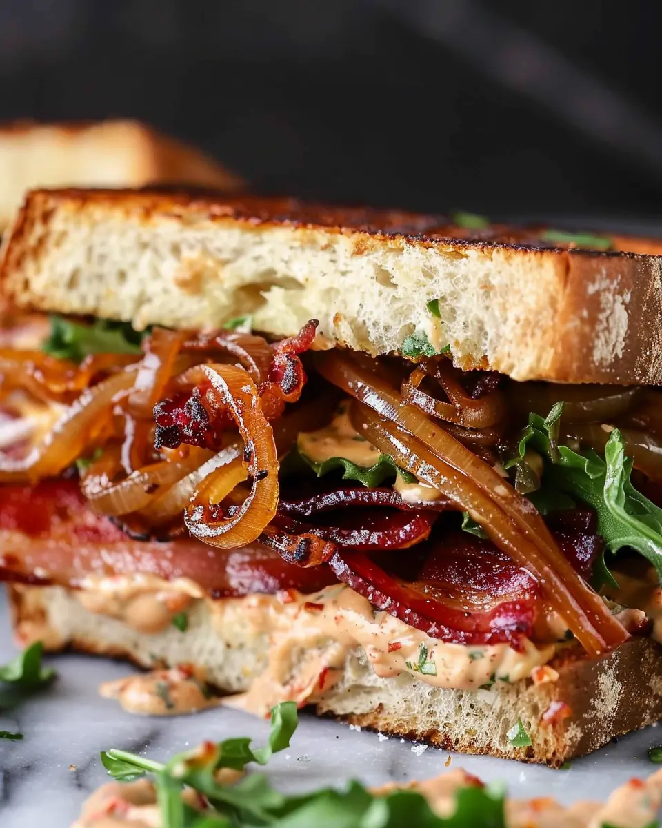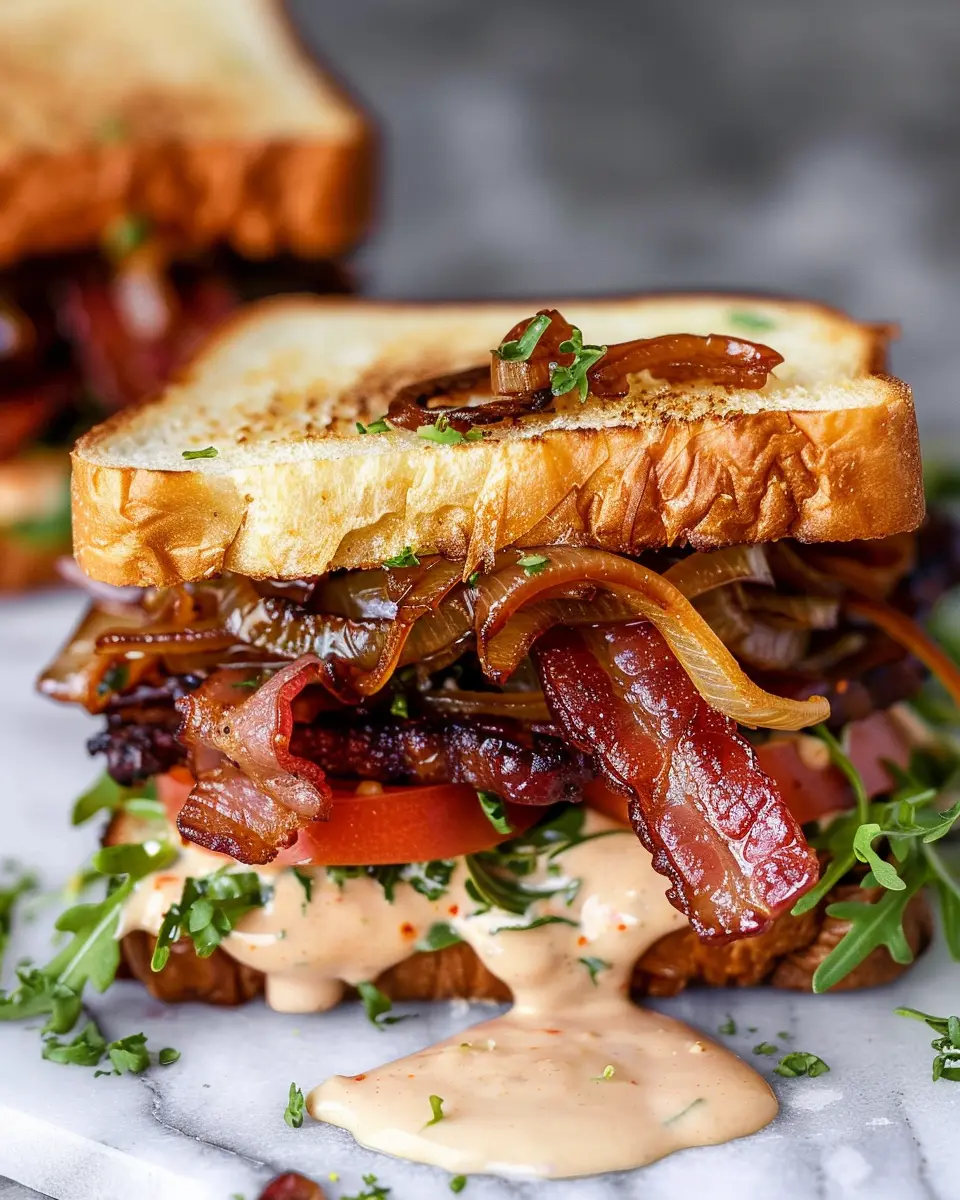 Keywords: bacon, sandwich, caramelized onions, chipotle mayo