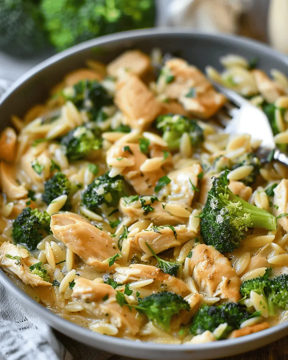 Keywords: Cheesy Chicken Broccoli Orzo, Comfort Food, Easy Recipe