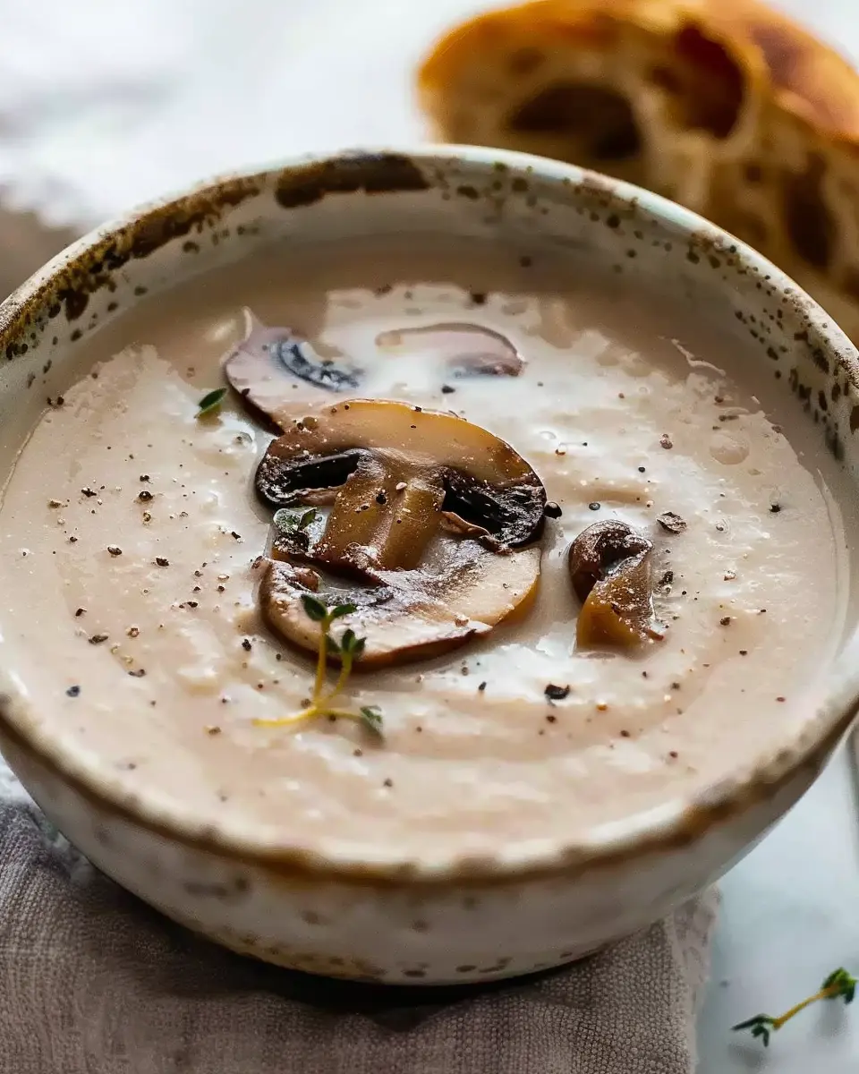 PrintCream of Mushroom Soup: Easy Recipe with Turkey Bacon Delight