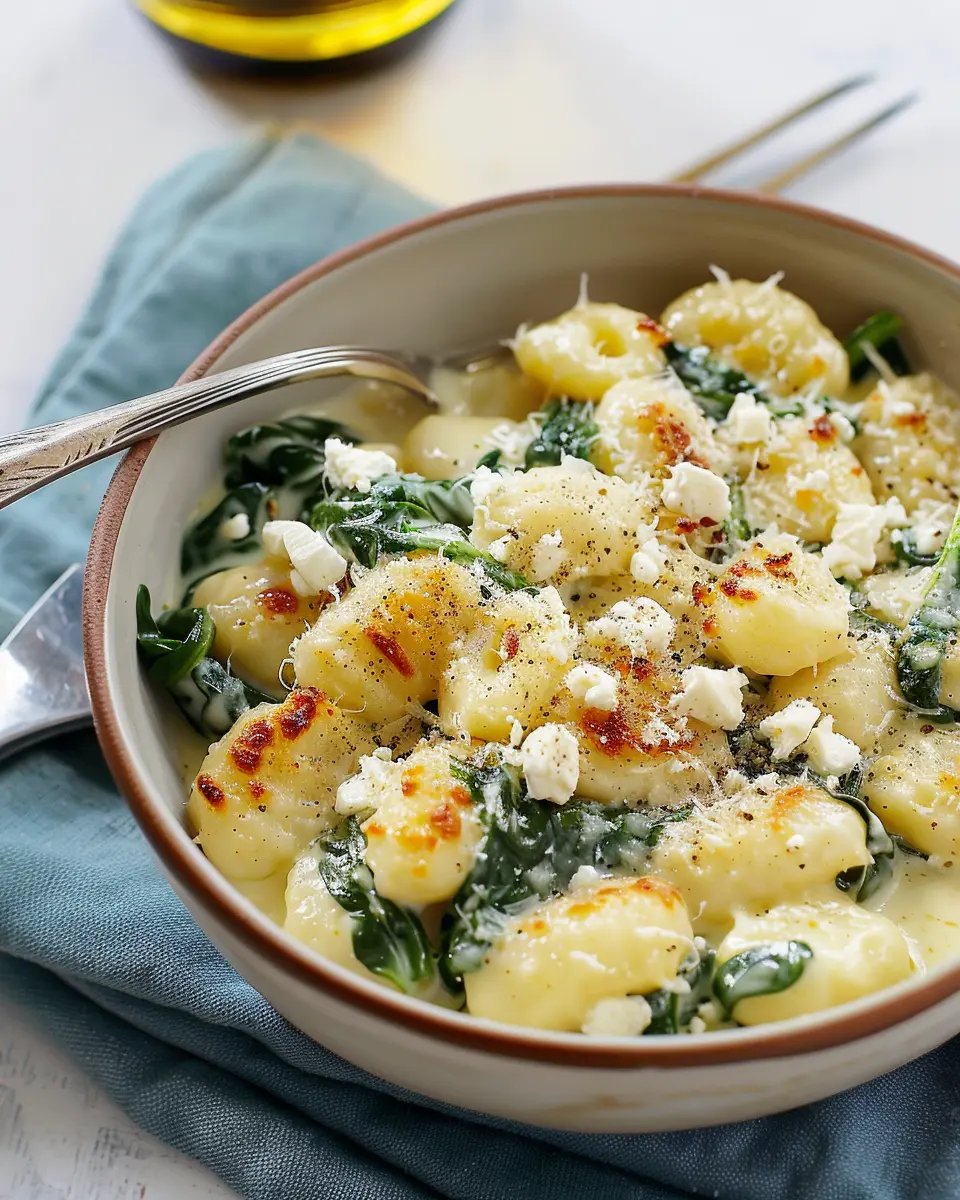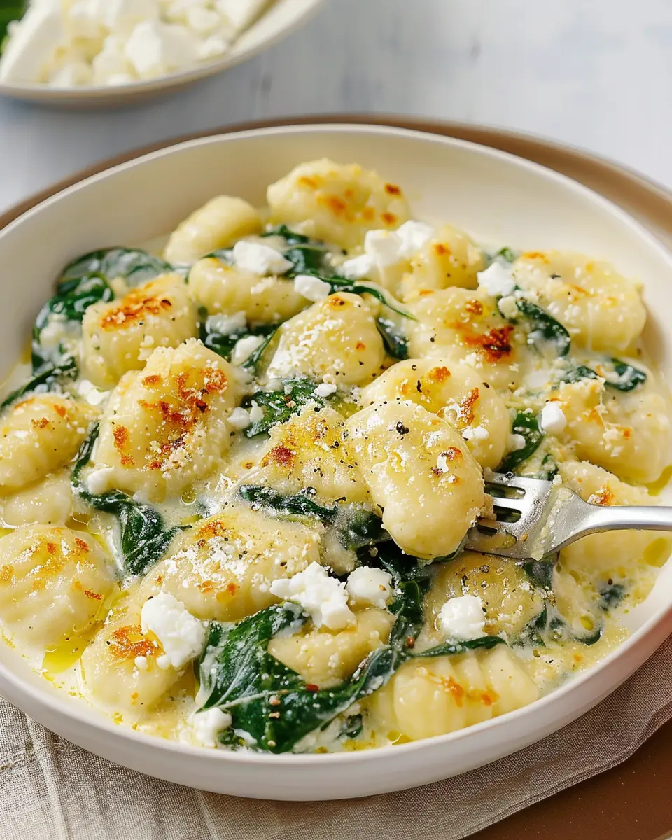 A comforting dish featuring tender gnocchi, fresh spinach, and creamy feta cheese.