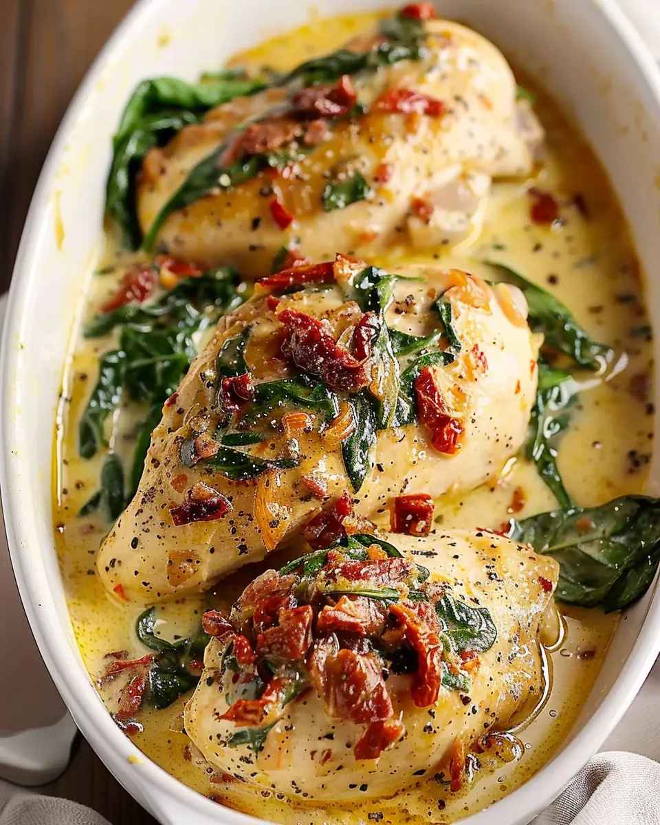 Delicious CrockPot Tuscan Garlic Chicken made with fresh spinach and tangy sun-dried tomatoes, perfect for a comforting meal.