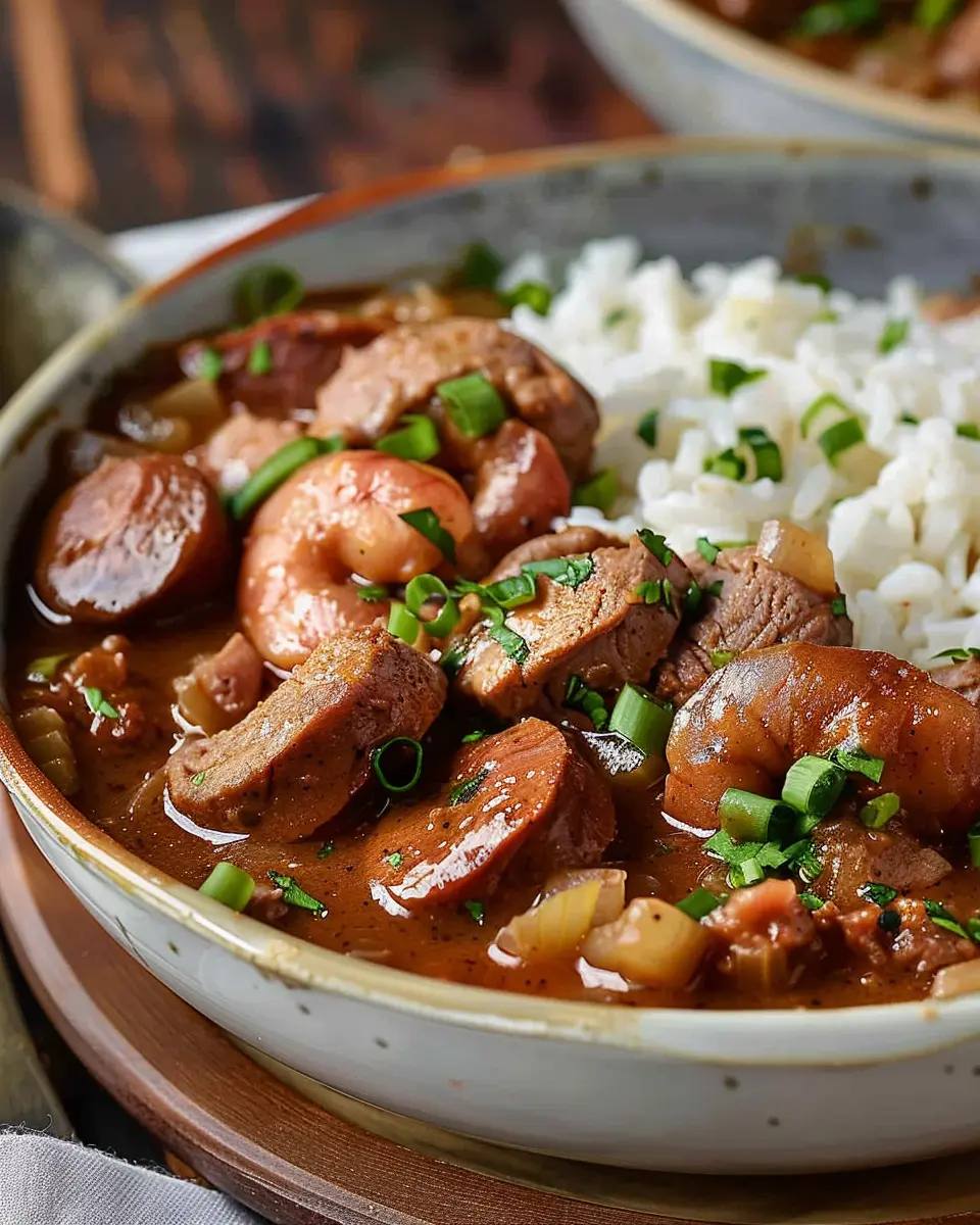 A delicious and comforting gumbo recipe featuring turkey bacon and chicken ham, perfect for a hearty meal.