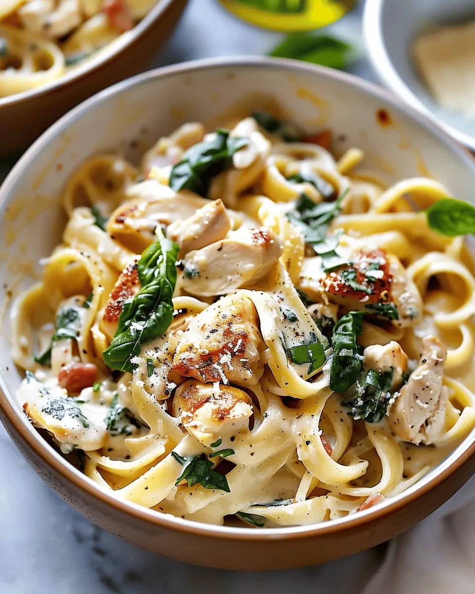 A flavorful and healthier take on the traditional chicken pasta dish, made with fresh spinach and low-fat ingredients.