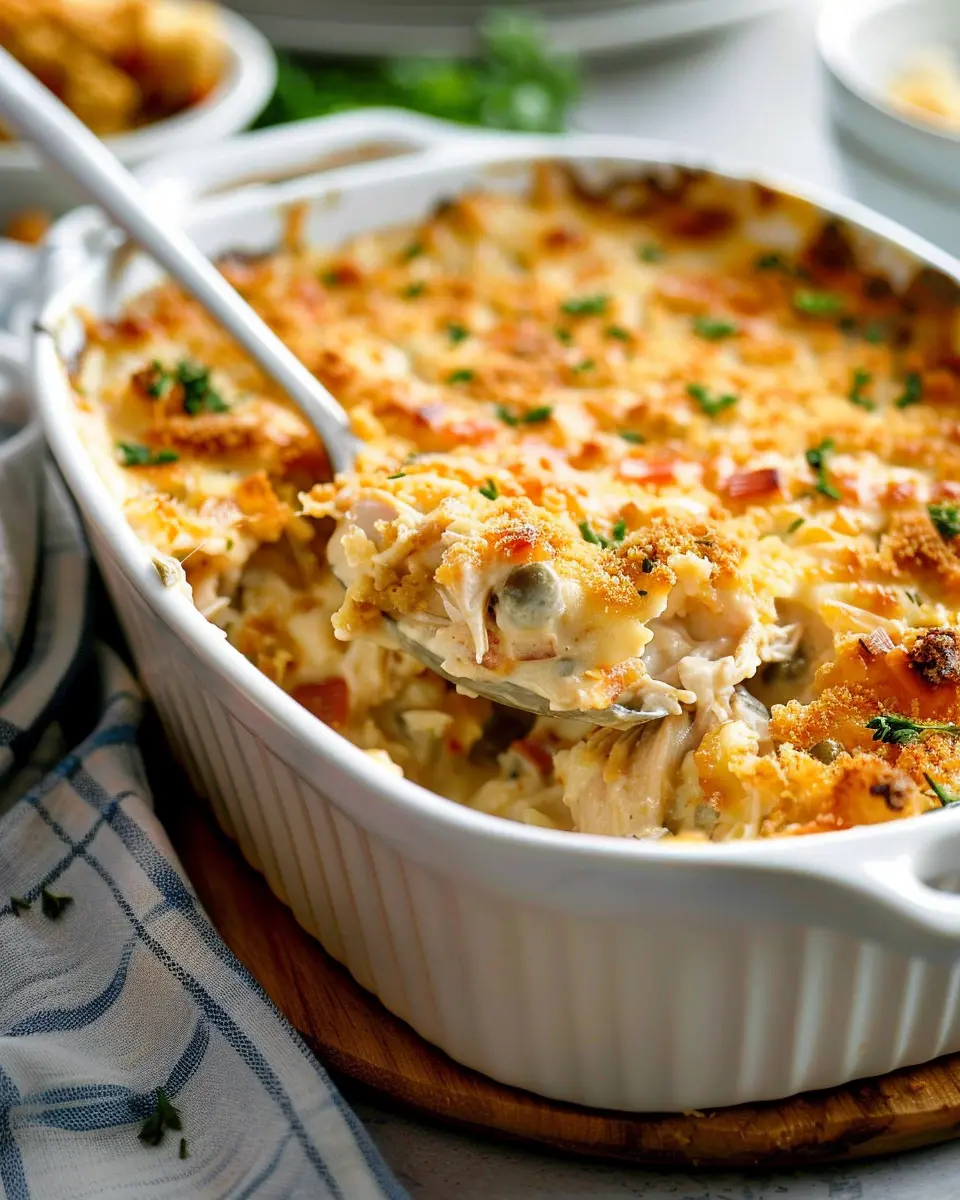 Discover the ultimate comfort food with this indulgent Million Dollar Chicken Casserole packed with flavor and topped with crispy turkey bacon.