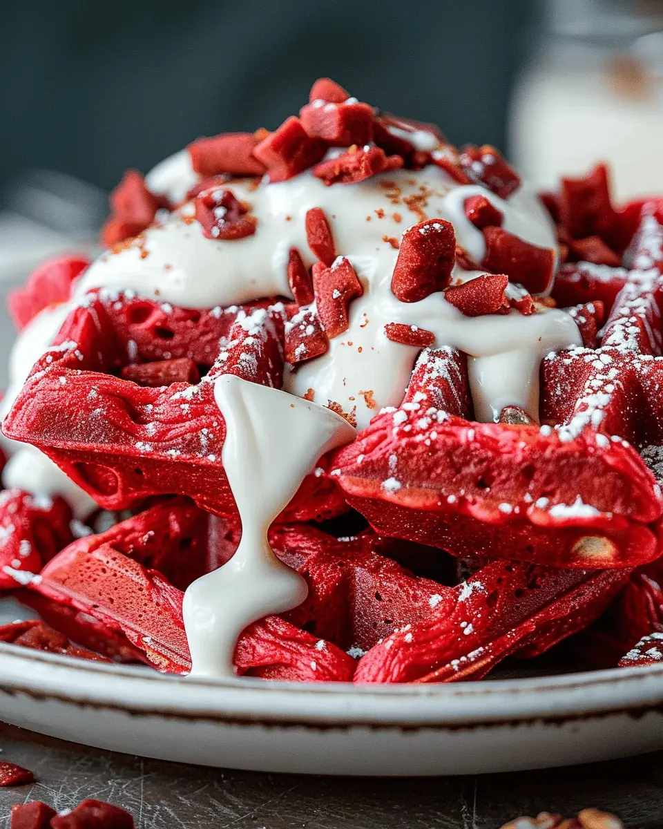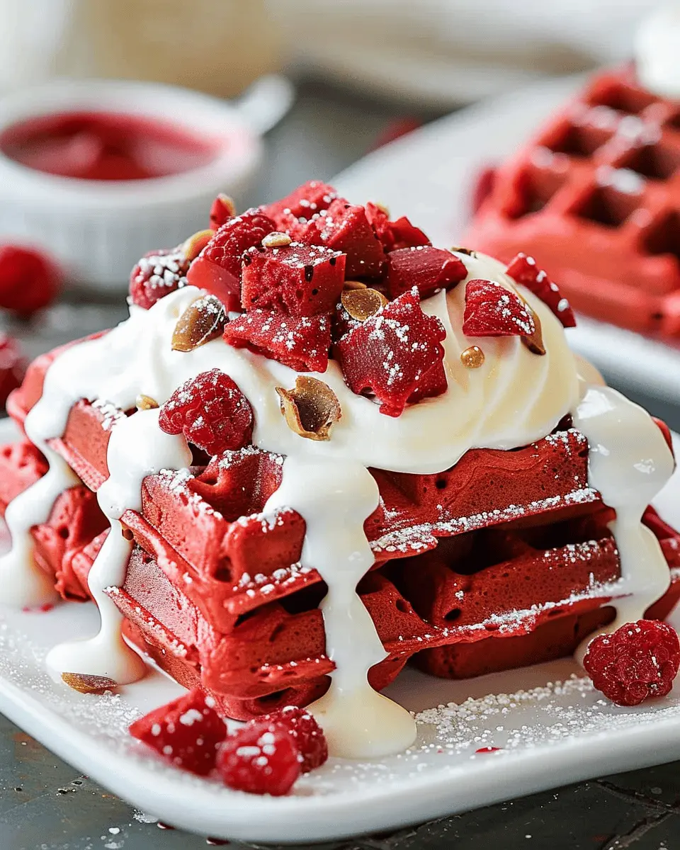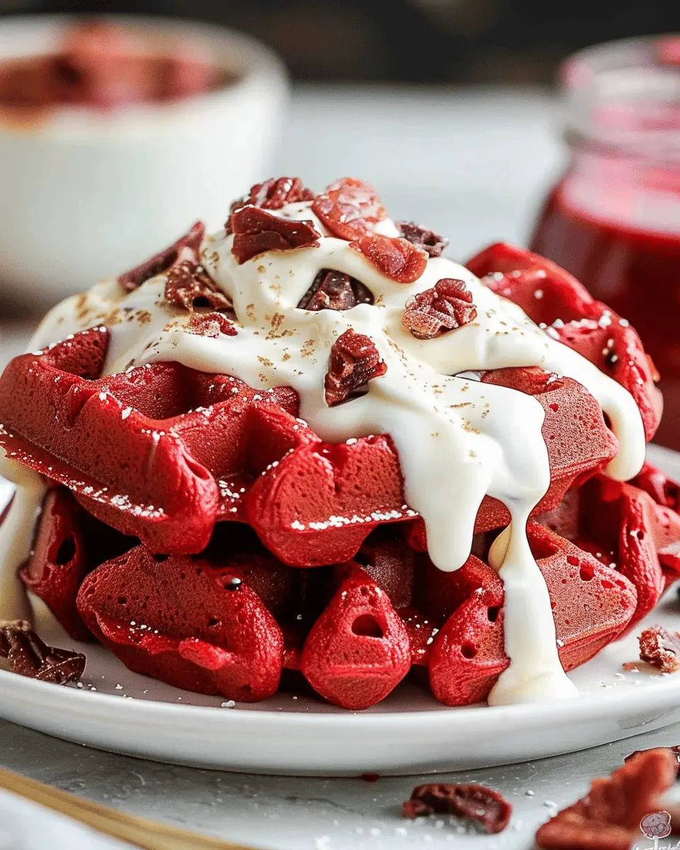 Now, you’ve got a stack of vibrant red velvet waffles ready to be topped! Don’t forget to whip up that cream cheese icing while the waffles cook—just mix all icing ingredients until smooth and drizzle over your warm waffles.