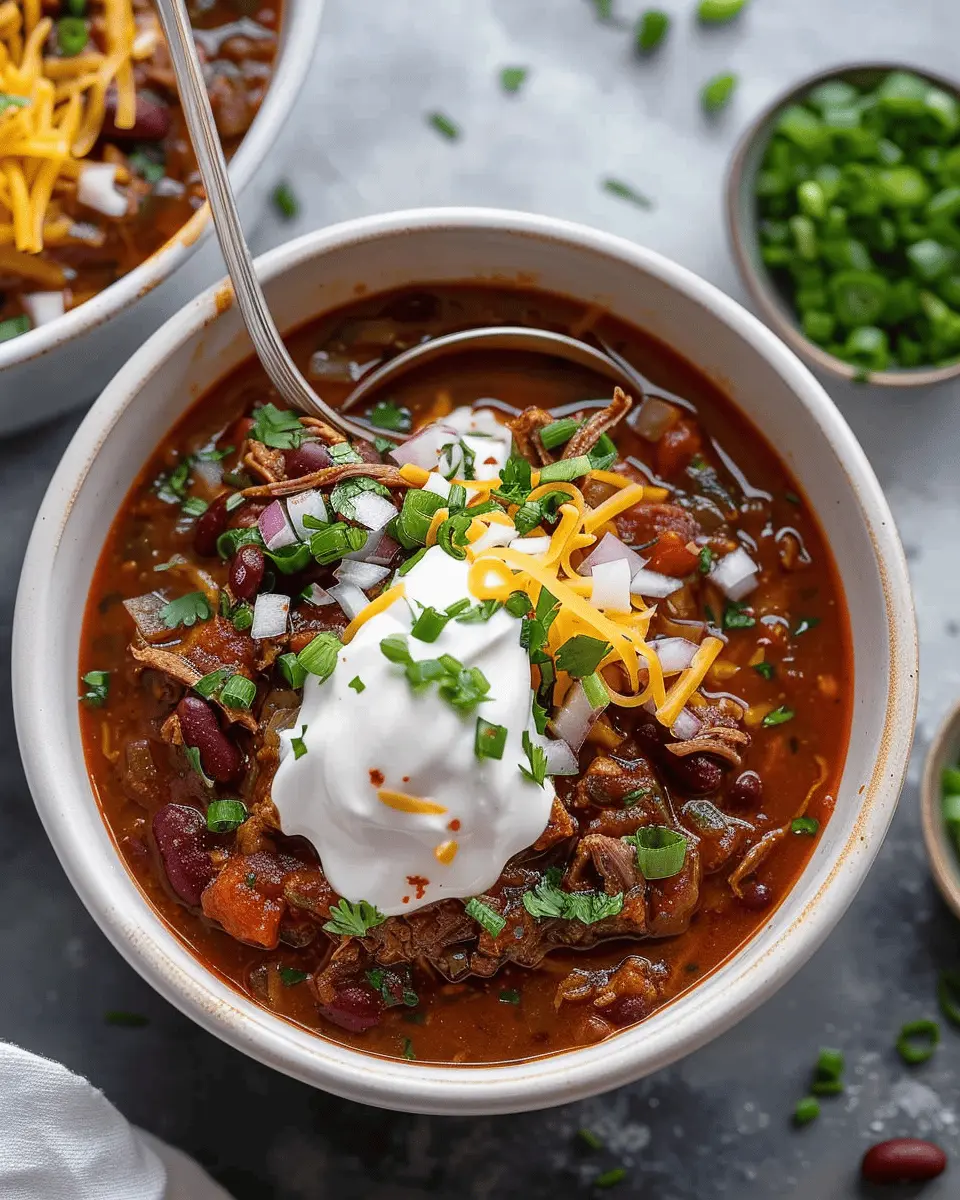 Shred with Care: Use two forks to shred the brisket within the chili, creating a rich and meaty consistency.