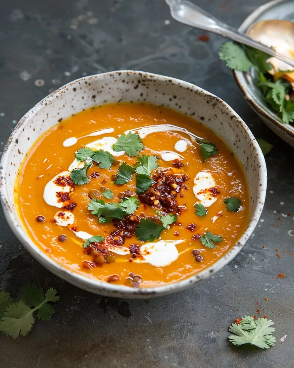 A comforting spiced carrot and red lentil soup enhanced with coconut and tamarind chili oil for added flavor.