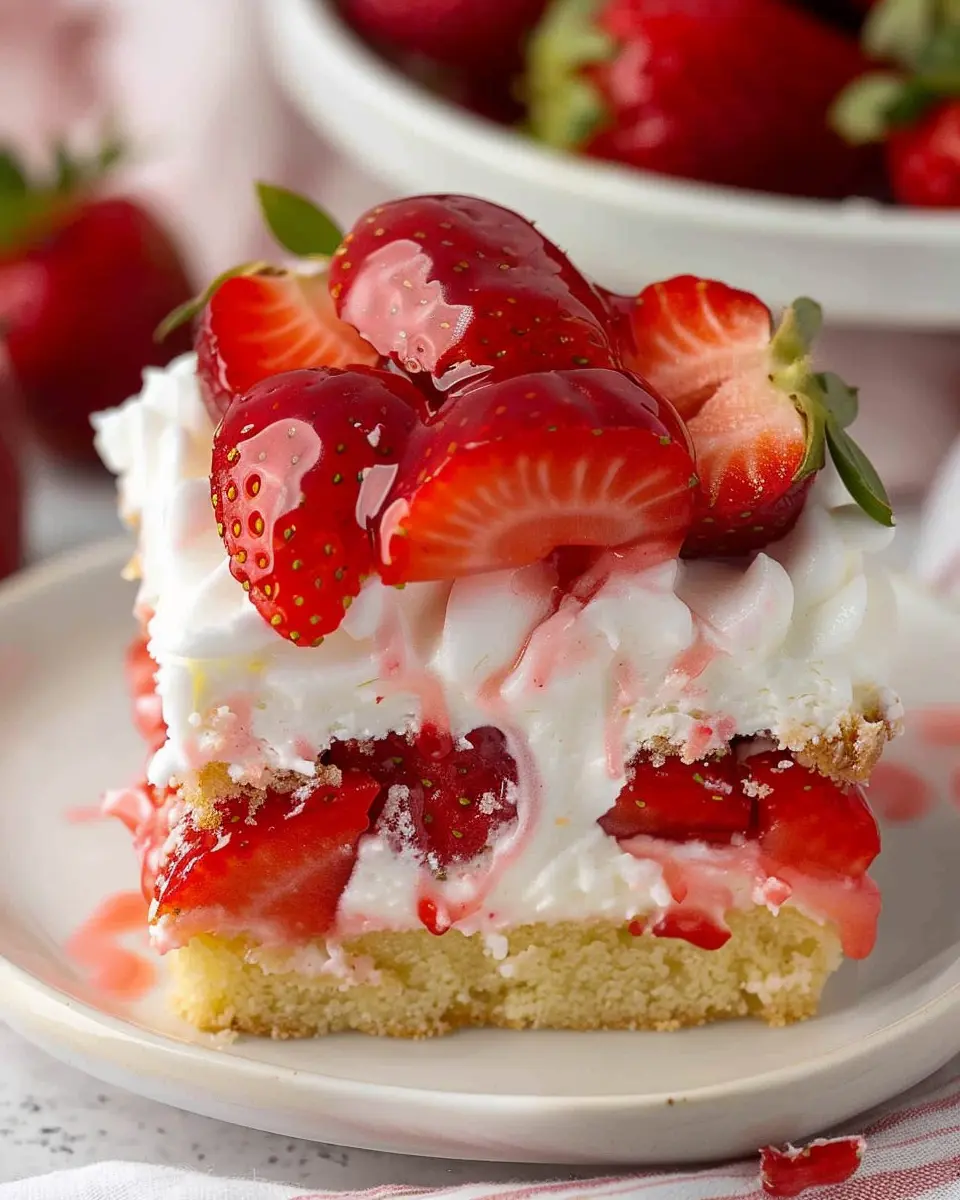After the cake has cooled completely, it’s time for assembly. Slice the cake into squares or rectangles, then layer fresh strawberries on top of each piece. Finally, finish with a generous dollop of whipped cream. It’s a delightful combination of flavors and textures that everyone will love.