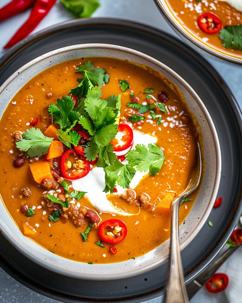 A comforting and delicious sweet potato and chili soup that’s perfect for chilly days.