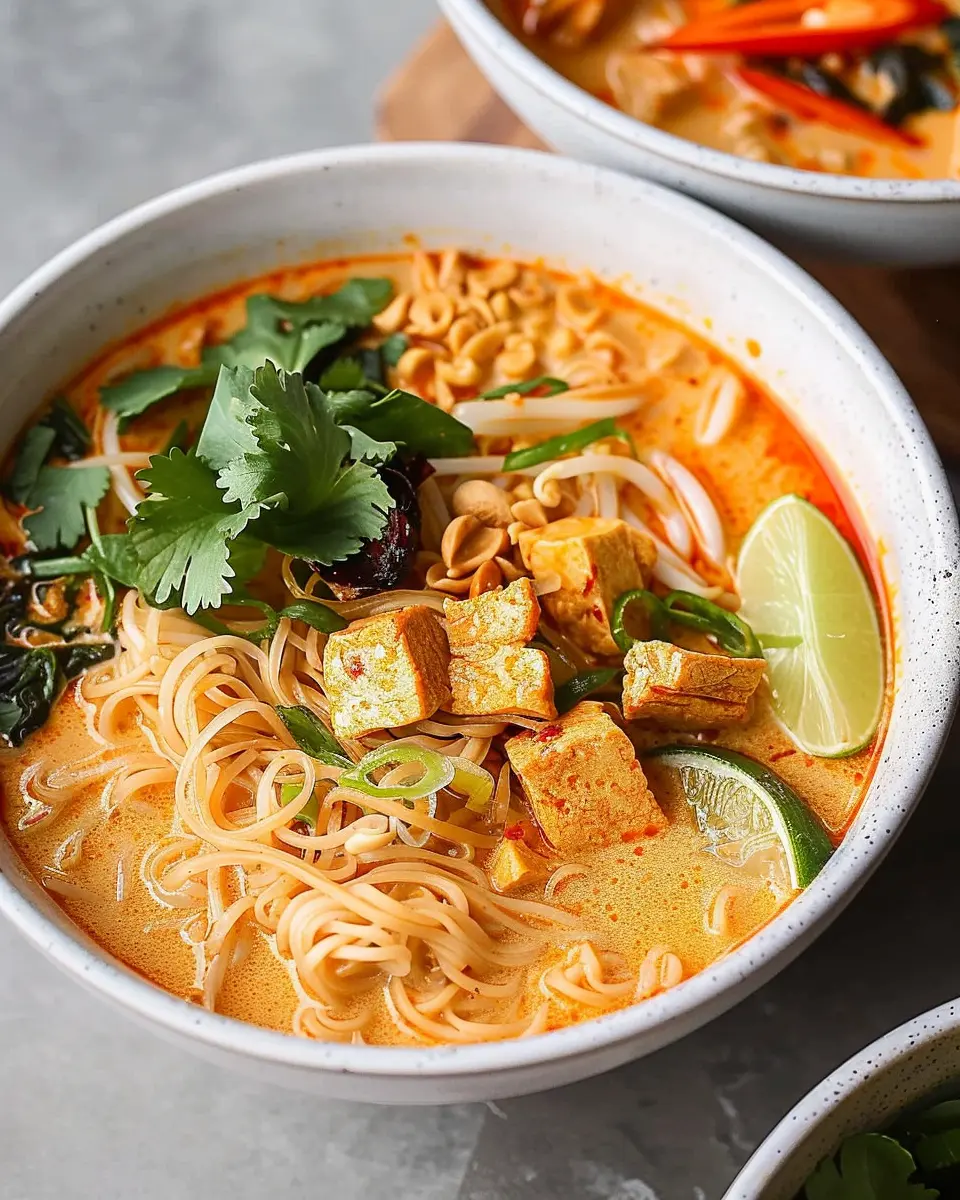 Once your noodles are cooked, it’s time to taste and adjust your soup. Maybe it needs a little more soy sauce or a spritz of lime juice for some acidity? Serve your Thai Red Curry Noodle Soup in bowls, topped with the crispy tofu and garnished with fresh herbs. The final touch of lime adds brightness and zest, making every spoonful delightful.